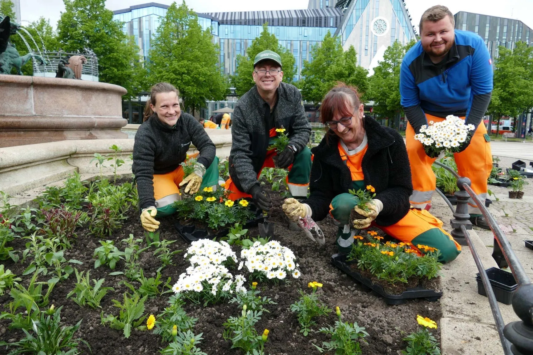 Am 16. Mai 2023 startete die Sommerbepflanzung der öffentlichen Grünanlagen. Mit Blick auf Artenvielfalt und Insektenschutz kommen am Mendebrunnen rund 4.000 besonders reich blühende und insektenfreundliche Blumen in die Erde. So locken beispielsweise Studentenblume, Eisenkraut, Salbei, Strauchmargerite, Petunie, Löwenmaul und Sonnenhut Bienen, Hummeln und Schmetterlinge an.