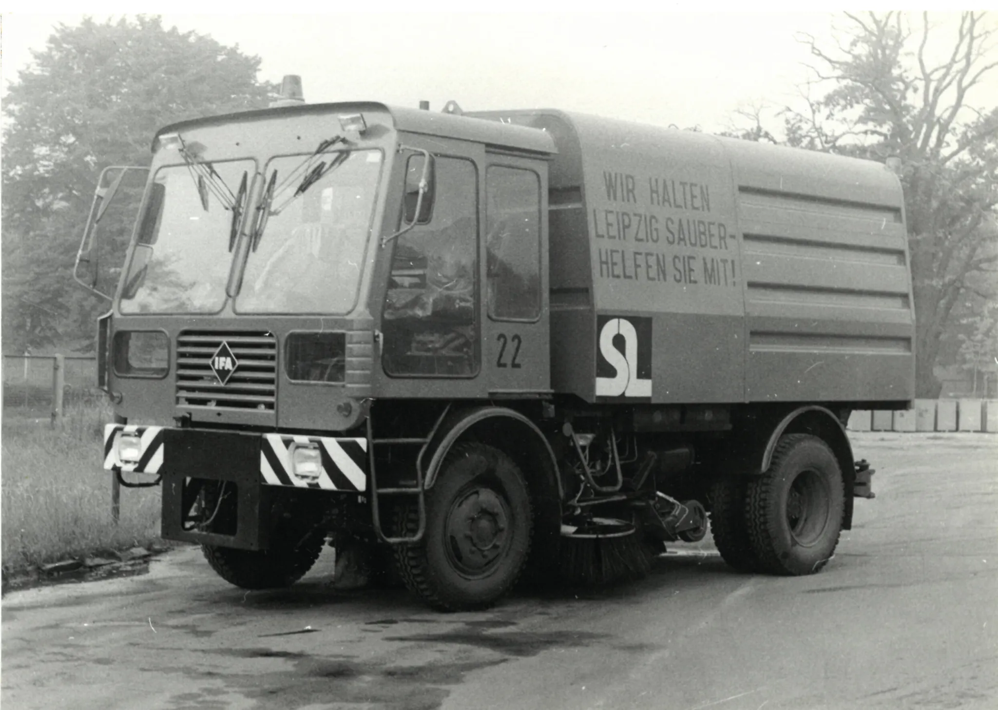 Schon damals waren unsere Fahrzeuge mit flotten Sprüchen versehen, die die Bürger/-innen in die Pflicht nahmen. So auch diese Großkehrmaschine IFA auf W50-Fahrgestell vom Typ 2301. Diese wurde im VEB Spezialfahrzeugwerk Berlin-Adlershof gebaut und 1981 auf der Leipziger Messe vorgestellt. Für die ganzjährige Nutzung entwickelt, kam sie vor allem bei der Reinigung des öffentlichen Verkehrsraums, von Rinnsteinen und Werkstraßen zum Einsatz.