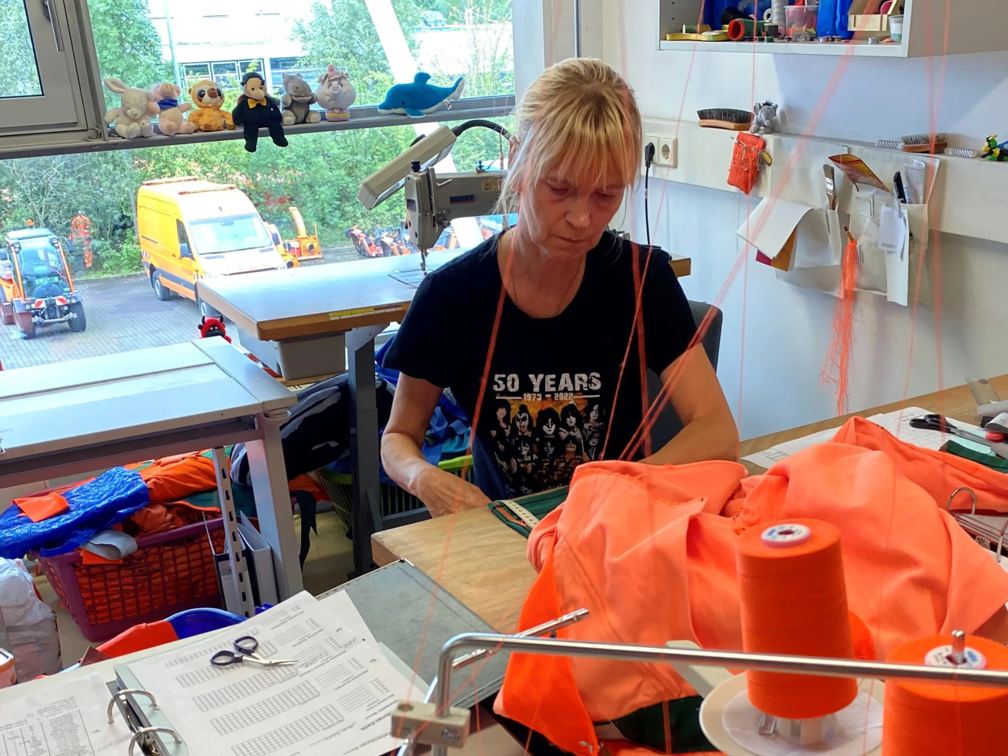Durch die Hände unserer zwei Näherinnen gehen in Spitzenzeiten wöchentlich ca. 100 Arbeitshosen sowie ca. 30 Arbeitsjacken und 30 T-Shirts bzw. Pullover. Dabei erneuern sie abgenutzte Reflex-Warnstreifen, ersetzen kaputte Reißverschlüsse und flicken sogar stark beschädigte Kleidung. Auch wird die Arbeitsschutzkleidung an die Körpergröße der Mitarbeiter/-innen angepasst. Zum Beispiel werden bei Bedarf Hosen gekürzt, damit diese sicher sitzen. Mit viel Fingerspitzengefühl kommen dabei Overlock- und Industrienähmaschine täglich zum Einsatz. An ihrem Beruf gefällt unseren Näherinnen besonders, dass sie ihren Traumberuf ausüben und dabei gleichzeitig etwas für die Umwelt tun können.