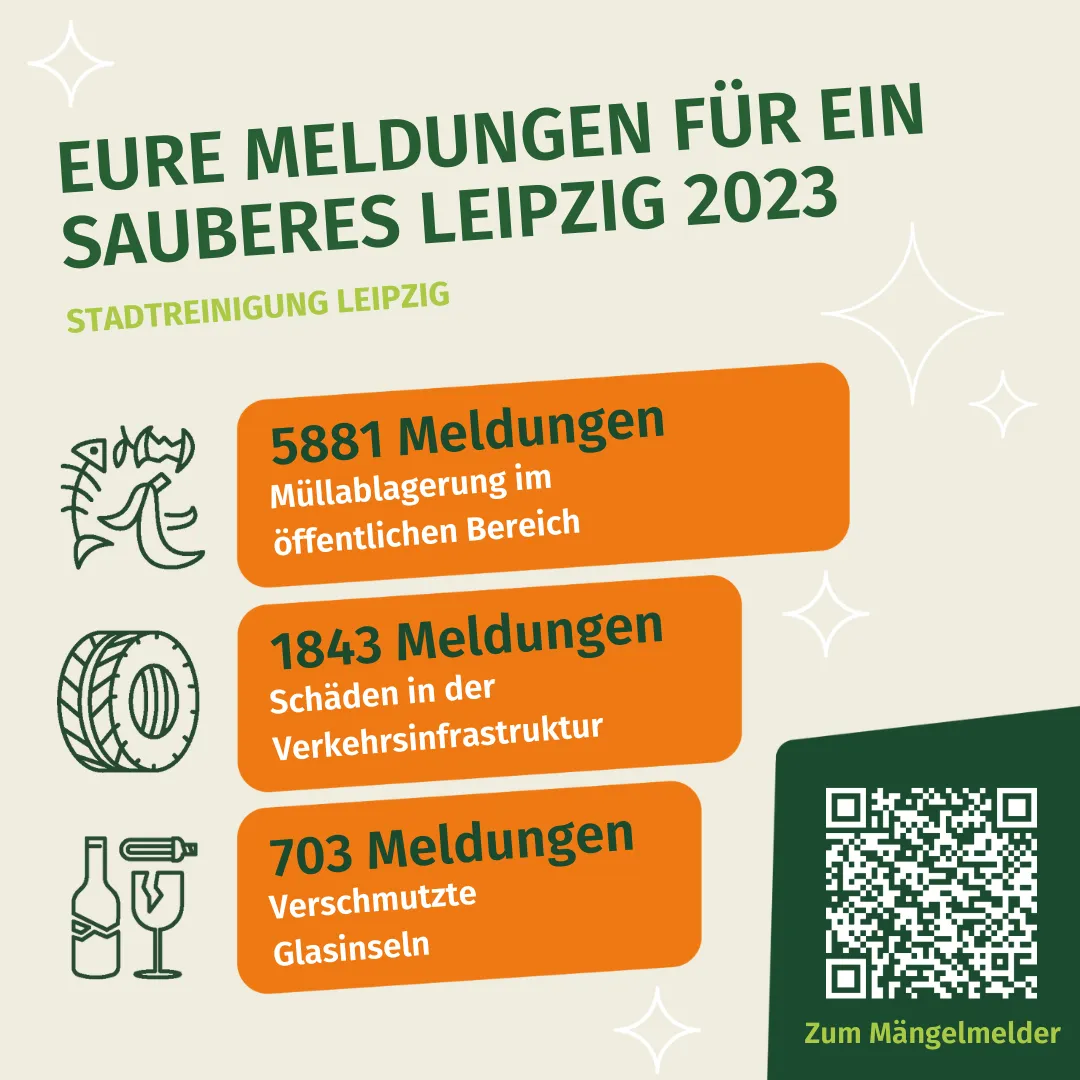 Sie möchten auch etwas melden? Besuchen Sie einfach https://stadtreinigung-leipzig.de/wir-fuer-eine-schoene-stadt/wir-sind-fuer-sie-da/maengelmelder oder scannen Sie den QR Code!