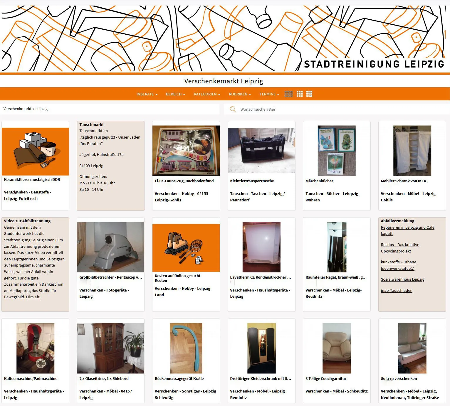Mit dem Verschenkemarkt bieten wir eine kostenlose, nicht kommerzielle Online-Gebrauchtwaren-Börse, denn unser Ziel ist die Förderung der Abfallvermeidung im Interesse des Umwelt- und Ressourcenschutzes. Damit tragen wir zur Zero-Waste-Strategie der Stadt Leipzig bei.