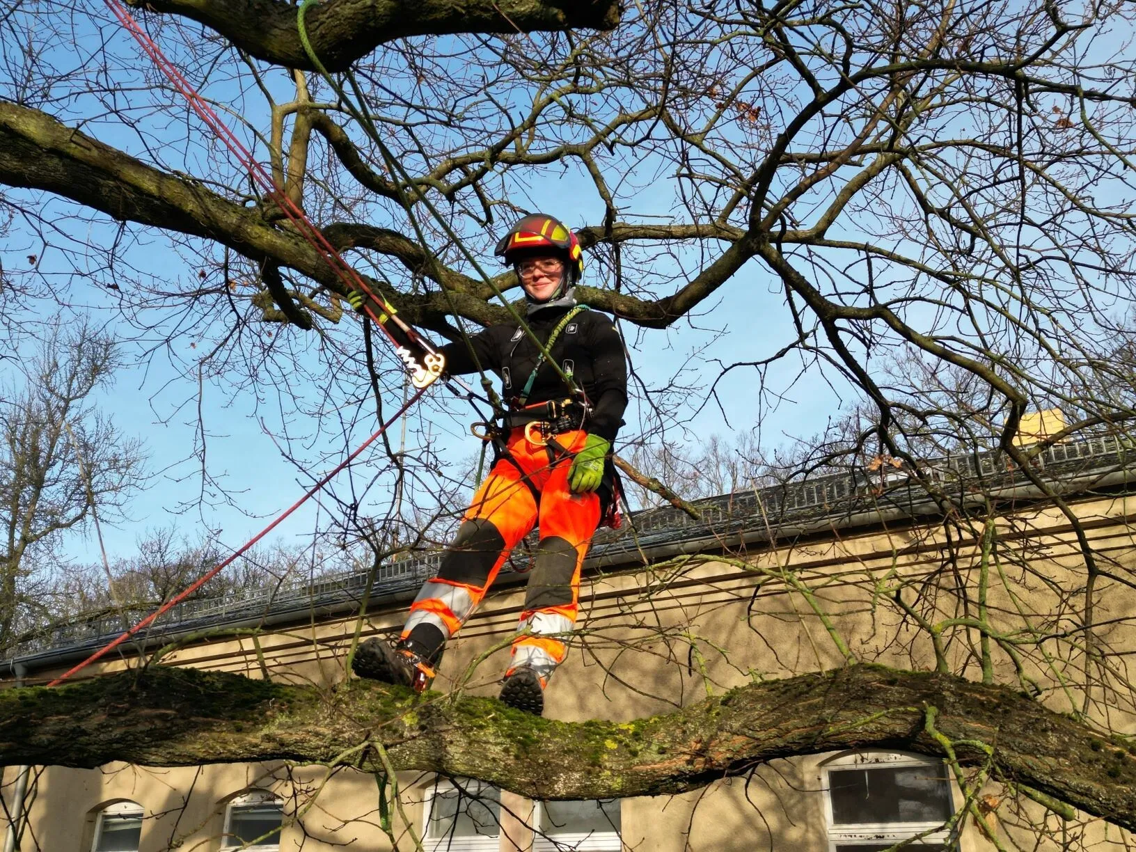 Drei Kolleg/-innen haben den Basiskurs der Seilklettertechnik in der Baumpflege (kurz: SKT-A) erfolgreich absolviert. Dort wo Leiter und Hebebühnen nicht verwendet werden können, wird die Seilklettertechnik eingesetzt. Die seilunterstützte Baumklettertechnik gibt unseren Kolleg/-innen die Möglichkeit beim Arbeiten am Baum beide Hände frei zu haben und die Baumpflege mit permanenter Sicherung durchzuführen. Gesichert werden unsere Kollegen mit mehreren Seilen und einem am Körper anliegenden Klettergurt.