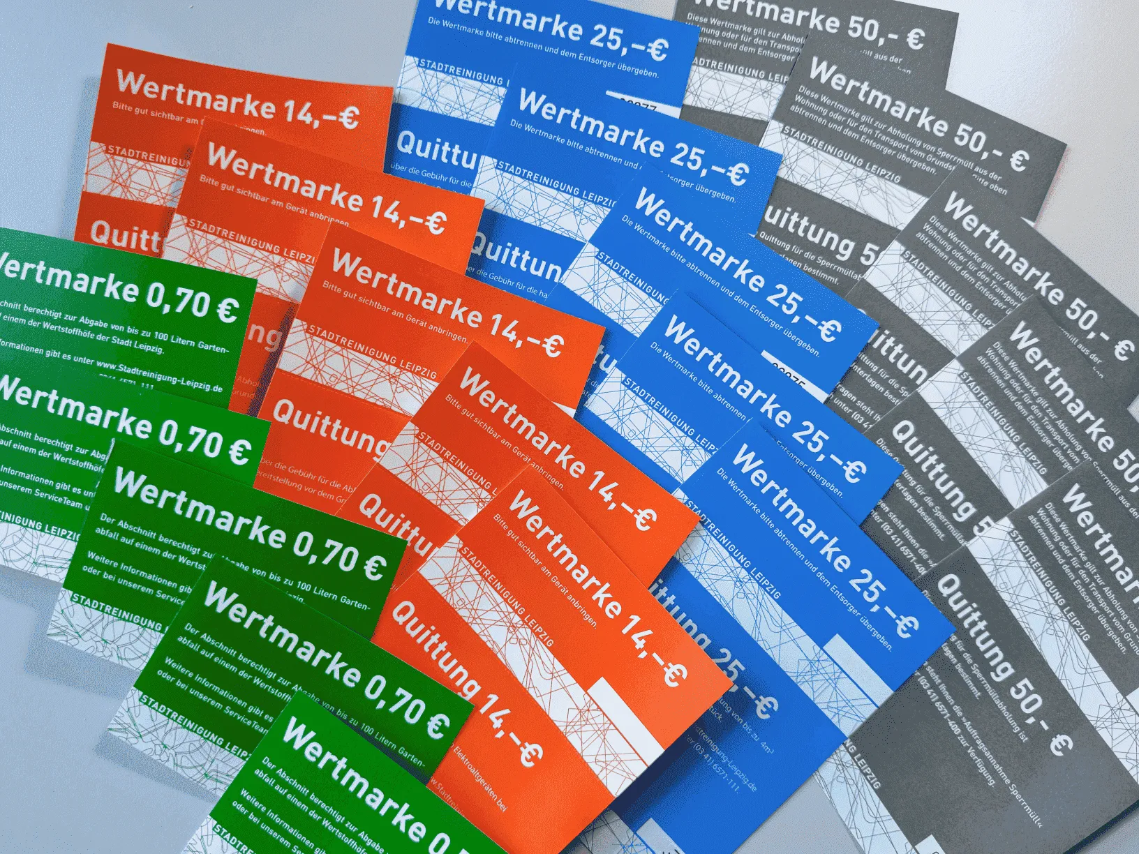 Seit dem 02.05.2025 werden auf den Wertstoffhöfen nur noch die gültigen 0,70€-Grünschnittwertmarken angenommen (lt. §5, Abs. 12 Abfallwirtschaftsgebührensatzung 2025/2026). Sollen Sie noch alte 0,50€-Wertmarken besitzen, dann können Sie diese bis zum 31.12.2025 im Laden fürs Beraten (Markgrafenstr. 5) oder an der Hauptkasse (Geithainer Str. 60) abgeben. Sie erhalten selbstverständlich ihr Geld zurück.