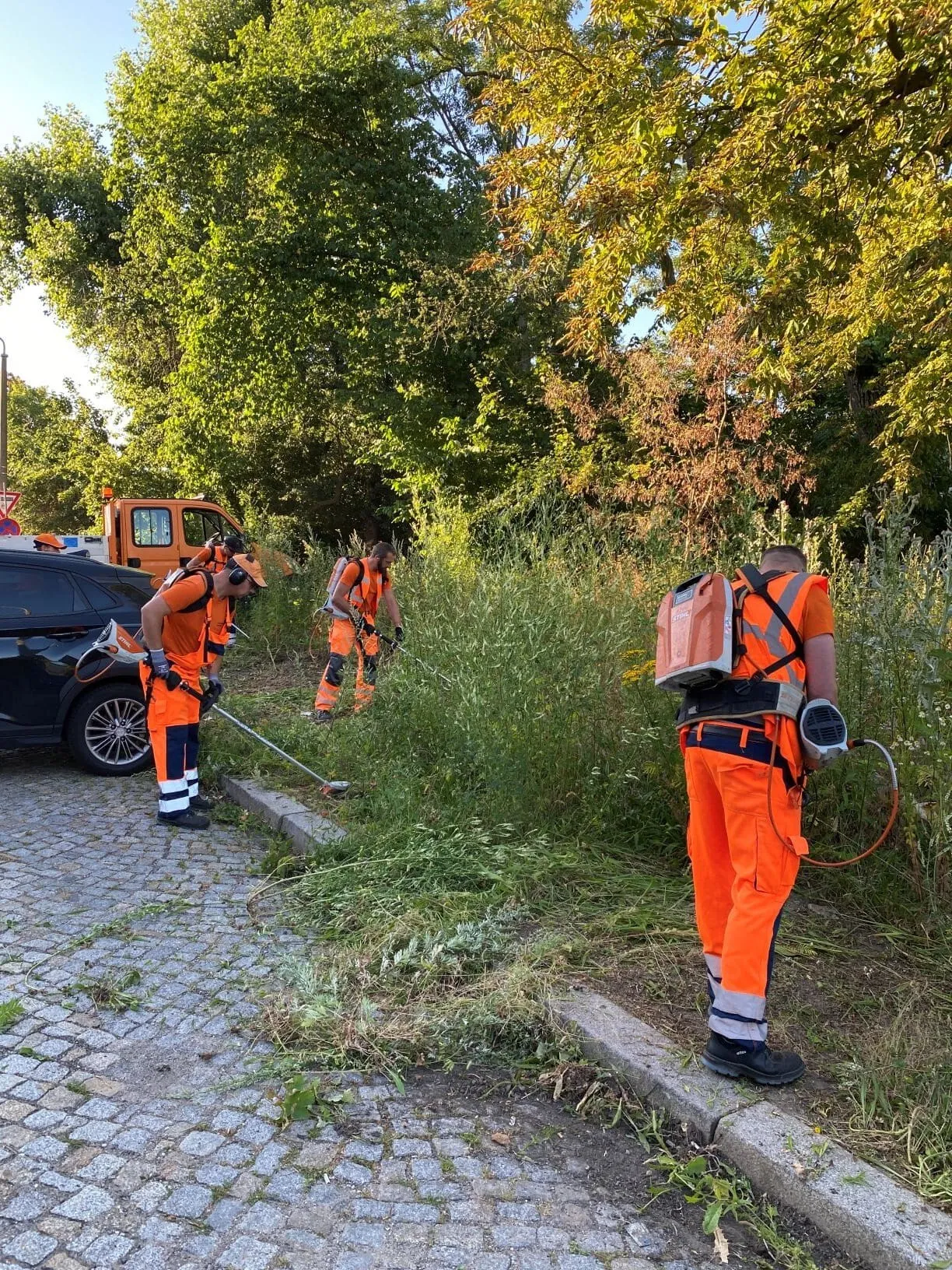 Es wurde wild rumgeschnippelt! Das, was Sie auf den Bildern sehen, ist tatsächlich ein Gehweg. Dieser wurde in der vergangenen Woche von 16 Kolleginnen und Kollegen aus der Straßenreinigung von Wildwuchs befreit. Dieser Einsatz in der Dauthestraße ist eine Verkehrssicherungsmaßnahme, damit Sie, sei es zu Fuß, im Auto oder auf dem Fahrrad allseits sicher auf den Straßen unterwegs sein können.