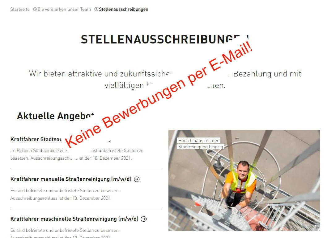 Bewerbungen, die Sie ab dem 06.12.2021 per E-Mail an die Stadtreinigung Leipzig gesandt haben, sind aufgrund des Hackerangriffs nicht bei uns eingegangen und können deshalb nicht berücksichtigt werden. Wir bitten Sie daher, uns Ihre bereits per E-Mail gesendete Bewerbung erneut und auch alle zukünftigen Bewerbungen bis auf Weiteres postalisch zukommen zulassen. Alle aktuellen Ausschreibungen verlängern sich bis zum 15.12.2021. Vielen Dank für Ihr Verständnis!