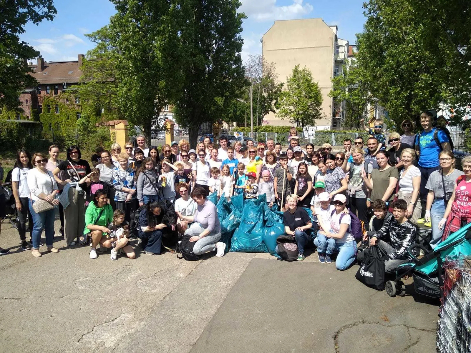 Am vergangenen Samstag säuberte fast 100 ukrainischen Geflüchtete gemeinsam den Lene-Voigt-Park. Dabei füllten sie 15 Säcke mit Abfall, kehrten um alle Bänke und sammelten Sperrmüll.