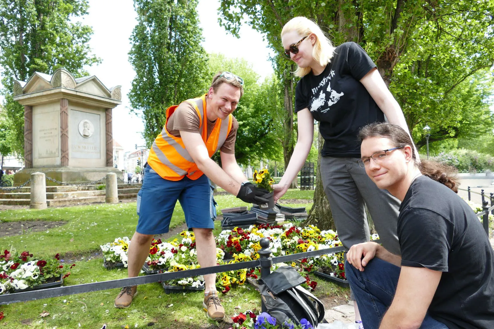 Viele Stiefmütterchen, Vergissmeinnicht und Goldlack haben dankbare Abnehmer/-innen am Bürgermeister-Müller-Denkmal gefunden. Nach dem unsere Auszubildenden und zwei Lehrausbilderinnen die Pflanzen am 10. Mai vorsichtig aus den Beeten genommen haben, glänzten die Blümchen in der Sonne rund um die Anlage. Bereits vor dem offiziellen Start um 12 Uhr tummelten sich die Ersten vor den Beeten. Im Anschluss bereiteten unsere Gärtner/-innen die Beete für die Sommerbepflanzung vor.